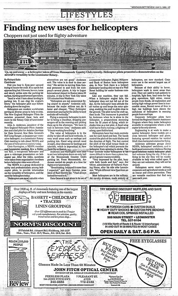 First, you hear it. Eyes peer upward trying to locate the craft. It’s a speck but approaching fast. It lowers, hovers, turns and slowly settles onto the parking lot surface, hurtling sand toward spectators.“Sand is what I hate about landing in parking lots. It can clog the engine’s filters,” the helicopter pilot says before shutting down the engines.Helicopters are modern workhorses serving in diverse areas to help society. The New England Helicopter Pilots Association presented these facts and more to the Rotary Club of Leominster recently.John A. Anderson, president of the New England Helicopter Pilots Association and chief pilot for Aviation Services for Dad General, flew Data General’s Bell Long Ranger, a six-passenger executive helicopter, to a Leominster Rotary Club meeting to talk about NWHPA and the uses of helicopters in society today.Chris Harrington, a NEHPA member and Leominster resident, flew a Robinson R22, a two-person helicopter and gave a videotape presentation on helicopter use. After the video, questions were taken from organization members before helicopter rides were offered.The NEHPA is a group dedicated to safety and professionalism among helicopter pilots, to provide information on the versatility of helicopters, and the need for helicopters today.“Helicopters are most valuable when alternative are not good,” said Anderson. The value is in door to door service. His service is moving Data General personnel to and from the company’s several plants. A trip to Logan International Airport in Boston takes 20 minutes. A trip to New York City takes 120 minutes from Westboro.“Helicopters are not economical flying airport to airport,” Anderson said, “because the major airlines can do it faster and cheaper. They (helicopter owners) are paying for the ability to land and take off vertically.”Flying a corporate helicopter is similar to being a chauffeur, dropping passengers off in the morning and picking them up in the afternoon. “We have to wait in between time,” Anderson said. “It beats working for a living.”The value of helicopters is in the ability to take off and land vertically, in very small areas such as rooftops and parking lots. Fixed wind aircraft nee straight, clear distances for landings and take-offs, which is impractical in New Your City or Boston.Anderson and Harrington were able to set tow helicopters down on only half of the Monoosnock Country Club’s parking lot. From Monoosnock, Anderson carried six people at a time for flights over Leominster.“Breathtaking. I enjoyed it more that I expected,” said Jerry Cormier, President of Ruel Electric Inc. “I had always looked forward to it.”Data General is not alone in its use of corporate helicopters. Digital, Millipore, and Bank of Boston have helicopters also. In New York, there is a heliport (helicopter landing site) on top of a Wall Street building for easier business commuting.Like any machine, they can fail. When a helicopter engine fails, the helicopter does not just gall out of the sky. As the helicopter loses altitude the air rushed up and keeps the rotor spinning, enabling the craft to glide close to the ground. The pilot turns the craft up, the lands. This maneuver is practiced by Anderson when he is alone in the helicopter, a preparedness stemming from his 32 years of flying, which includes time as a test pilot. A fixed wind craft has to find a runway, a highway 7, or a long, open field to land.Helicopters have four main controls: one for each hand and foot. The hands control the pitch of the main blades and the direction of flight. The feet control the pitch of the small torque blade on the helicopter’s tail which prevents the helicopter from spinning in circles. The four controls make helicopter a bit more difficult to learn than a plane but, give it greater maneuverability.“Very impressed by the pilot, busy with both hands and feet,” says Jim Oliver, administrator of Fairlawn Nursing Home, after his ride over Leominster. “Whole different view that from an airplane.”Most helicopters are in the military. Air cavalry divisions, made entirely of helicopters are now standard. Corporate use is the second largesse use of helicopters.Because of their ability to hover, helicopters work in more areas than ever. They are used to rush patients to the hospital, fight fires, haul trees for logging operations, fight crime, rescue people from floods, oil exploration and setting high voltage power lines in inaccesi9ble areas. Recent hew of fires in high rise buildings has shown the usefulness of helicopters in rescuing people from rooftops.Corporate helicopter pilots have formed the Regional Disaster Assistance Program where they make helicopters available in emergencies where a helicopter is the only answer.Engineering is at work to make a quitter helicopter. Some models are a cross between a helicopter and a plane, featuring upward rotation for vertical liftoff, then horizontal rotation for flying.Anderson address groups about NEHPA, helicopter’s usefulness, and to build good community relations. Having good relations makes helicopter pilots feel welcome flying the city. If they are flying in the city they will be readily available to help when called upon. If they’re not welcome, they will not be around.Helicopters serve man’s military, corporate and agricultural needs as well as rescue and crime prevention. They are versatile machines that find new uses each year.